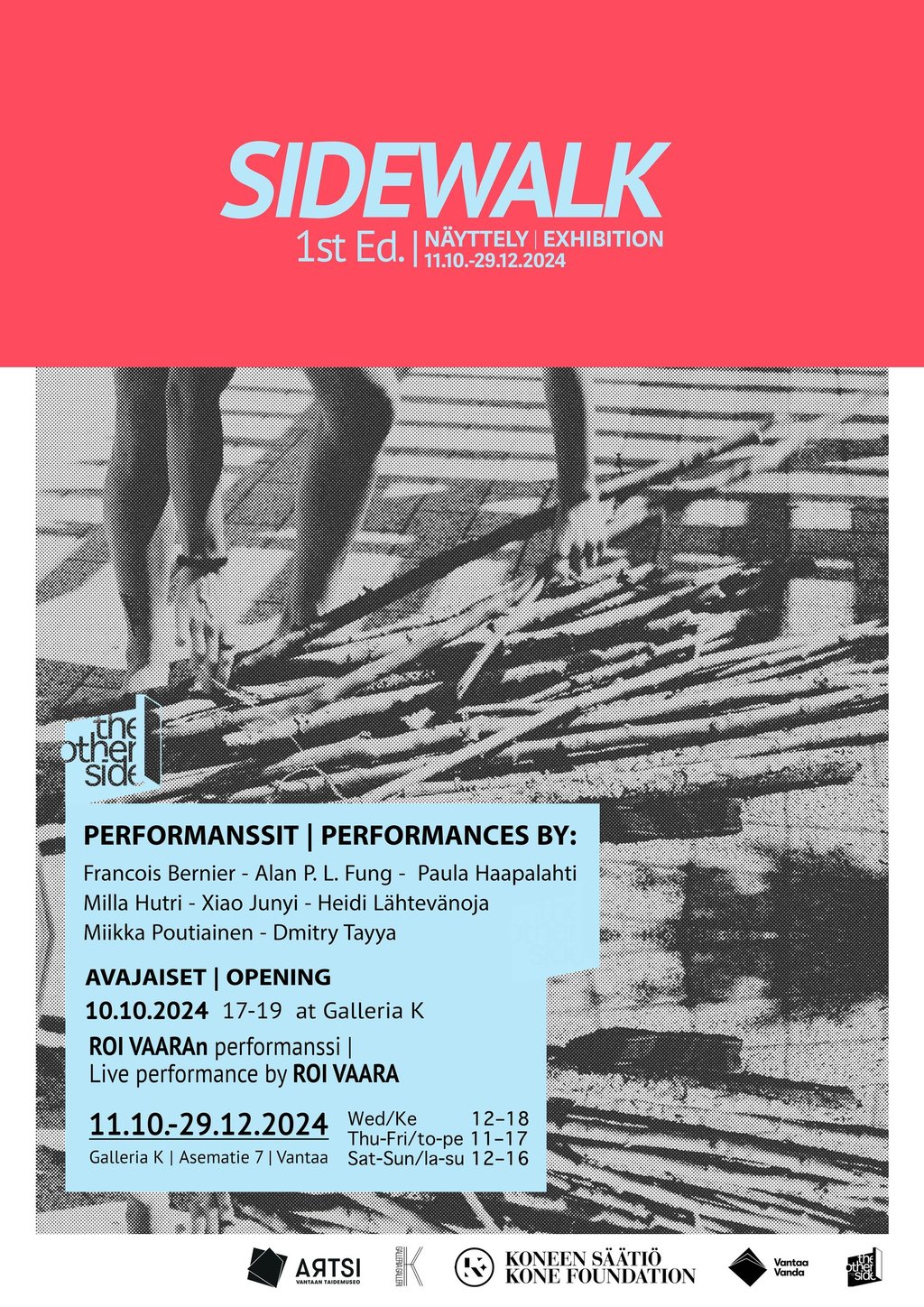 Sidewalk-projekti visioitiin dynaamisena hankkeena, jonka avulla Vantaan asukkaat pääsevät tutustumaan performanssitaiteeseen. Hanke korostaa performanssitaiteen vaikuttavuutta ja saavutettavuutta itseilmaisun välineenä. Sidewalk oli The Other Side -performanssitaidealustan alulle panema hanke, ja sitä tuki Koneen Säätiö.