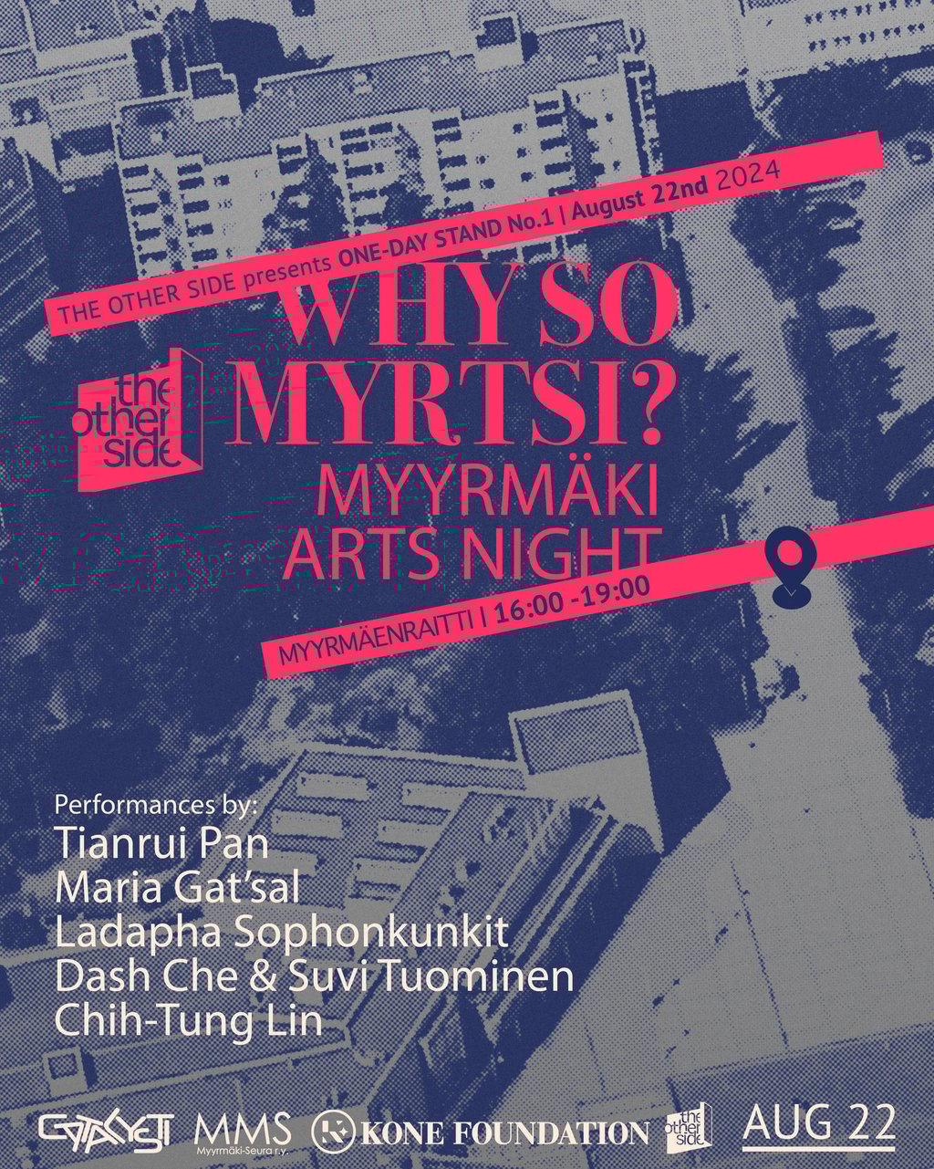 Vantaa juhlii tänä vuonna 50 syntymäpäiväänsä, ja Why So Myrtsi saavuttaa ensimmäisen täyden vuosikymmenensä merkkipaalun. Tätä juhlistaakseen The Other Side ja Catalysti ry lyöttäytyvät yhteen. Catalysti ry on vuonna 2013 perustettu voittoa tavoittelematon järjestö, joka toimii kulttuurienvälisten, aktivismin ja taiteen rajapinnoilla työskentelevien taiteilijoiden verkostona. Yhteistyön merkitys perustuu Myyrmäen kaupunginosan monikulttuuriseen ympäristöön, Catalysti ry:n ja sen jäsenten kulttuurienvälisyyteen sekä taiteilijoiden ja yleisön väliseen vuorovaikutukseen ja suhteisiin, joita rakennetaan performanssitaiteen keinoin.