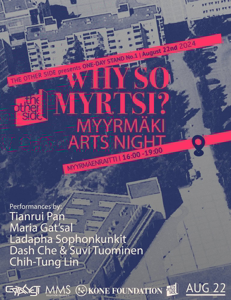 The Other Side innolla esittää: ONE-DAY STAND -tapahtuman ensimmäisen editio yhteistyössä Catalysti Artist Association -yhdistyksen kanssa Myyrmäen Taiteiden yössä 2024, jonka järjestää Myyrmäki-seura.