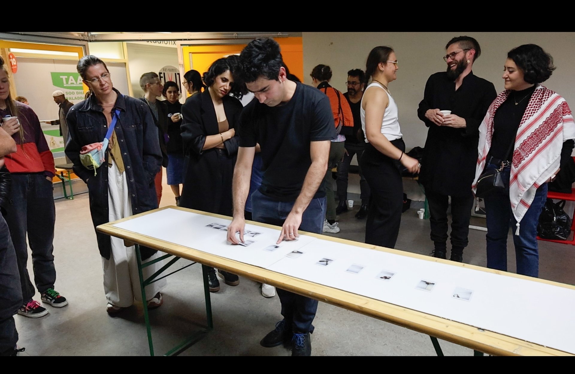 Askarizad takes a risk, but it pays off. The audience, just seconds ago engaged in conversations among themselves, is now eager to solve the mystery. Some people are lining up to take pictures, while others gather around the table to examine them. Anticipation heightens. Askarizad’s work unfolds in our minds as the photographs reveal what is behind the curtain: a small table, a tower assembled from wooden sticks, the performer’s arm, white walls. We never see the site fully, and instead, just like elsewhere in life, are left to imagine the present based only on the captured moments of recent history—misty, few, none lasting longer than 1/120th of a second.