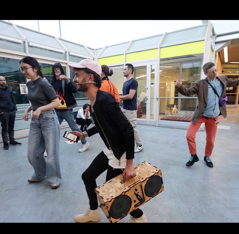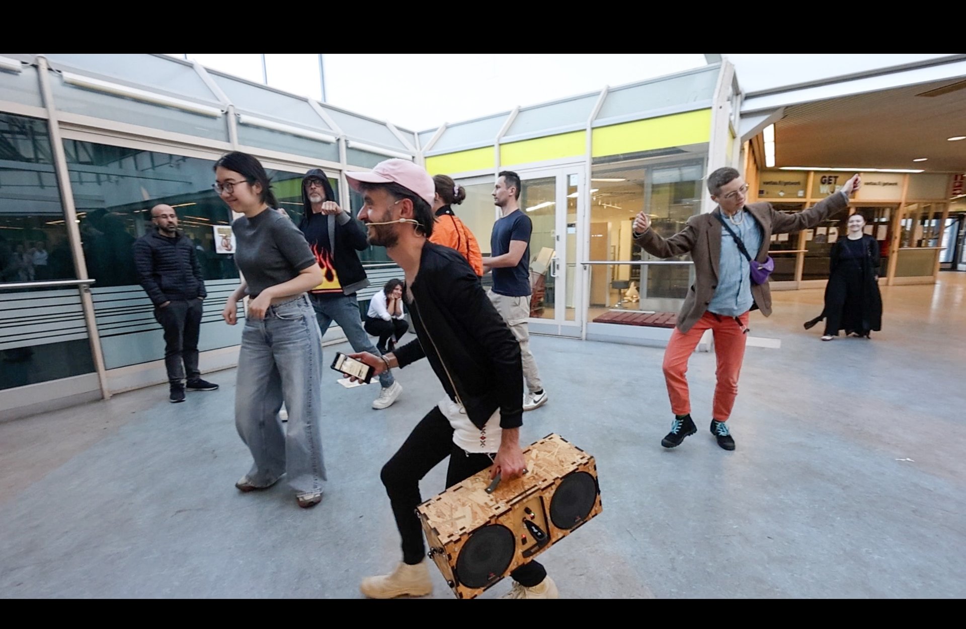 Raphaël Beau pierces through my thoughts with a loud, open-throated vocalization—a stringy "Ah." Then, he brings out a portable boombox. "I want to make a little station," he says after playing a fragment of a groovy, beat-driven track. This act of station-making becomes the structuring force behind Here For A Moment (Isomyyri), as Beau leads the audience through the mall, asking, “Is it okay to dance here?” His questions are provocative as much as permission-seeking. "Where in the mall can we dance?"