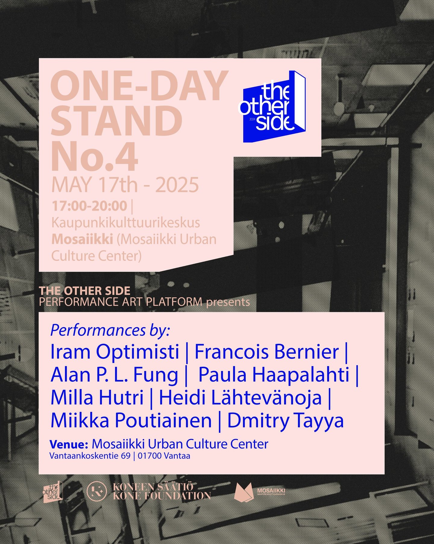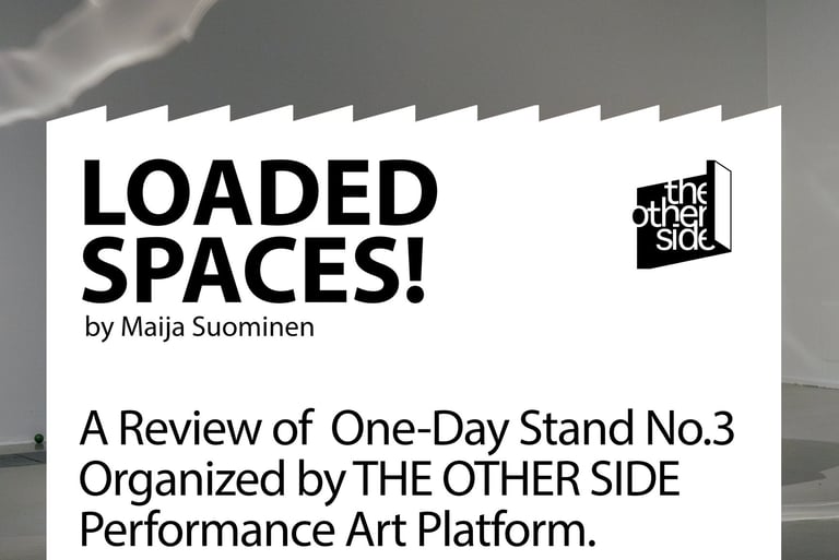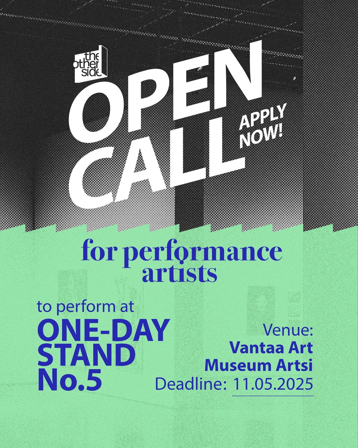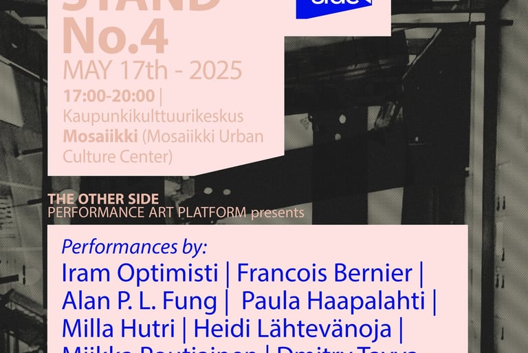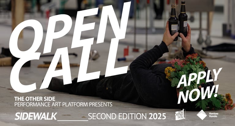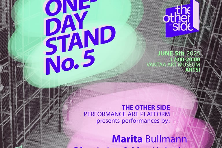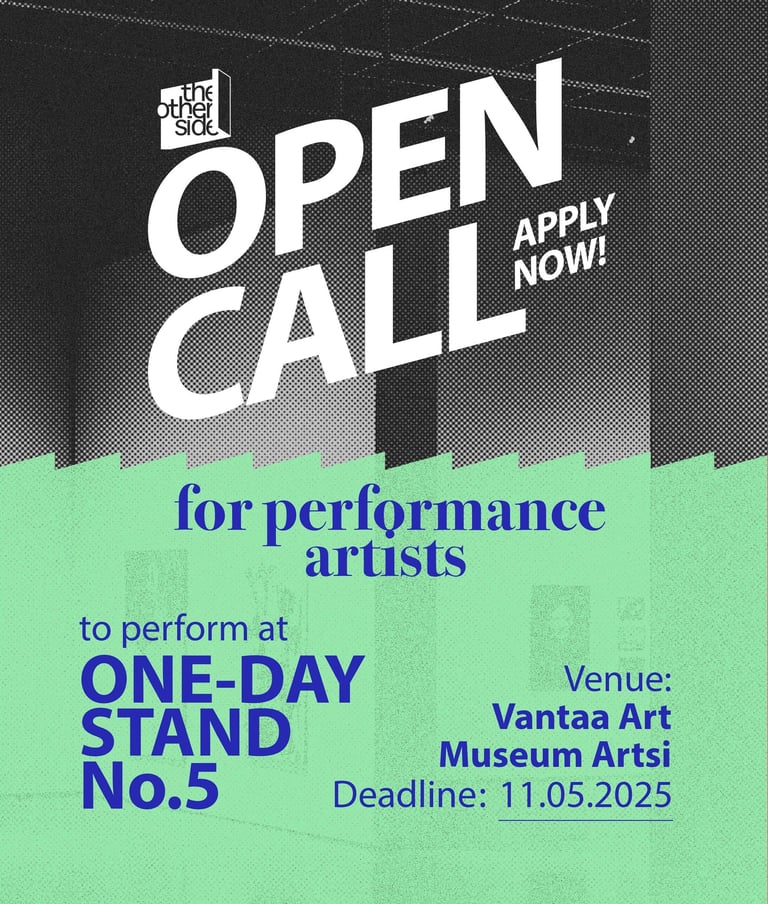 The Other Side kutsuu performanssitaiteilijoita lähettämään ehdotuksia teoksista, jotka esitetään One-Day Stand No. 5 -tapahtumassa 5. kesäkuuta 2025. Etsimme rohkeita ja mukaansatempaavia esityksiä, jotka aktivoivat tilaa ja luovat yhteyttä yleisöön uusilla tavoilla.