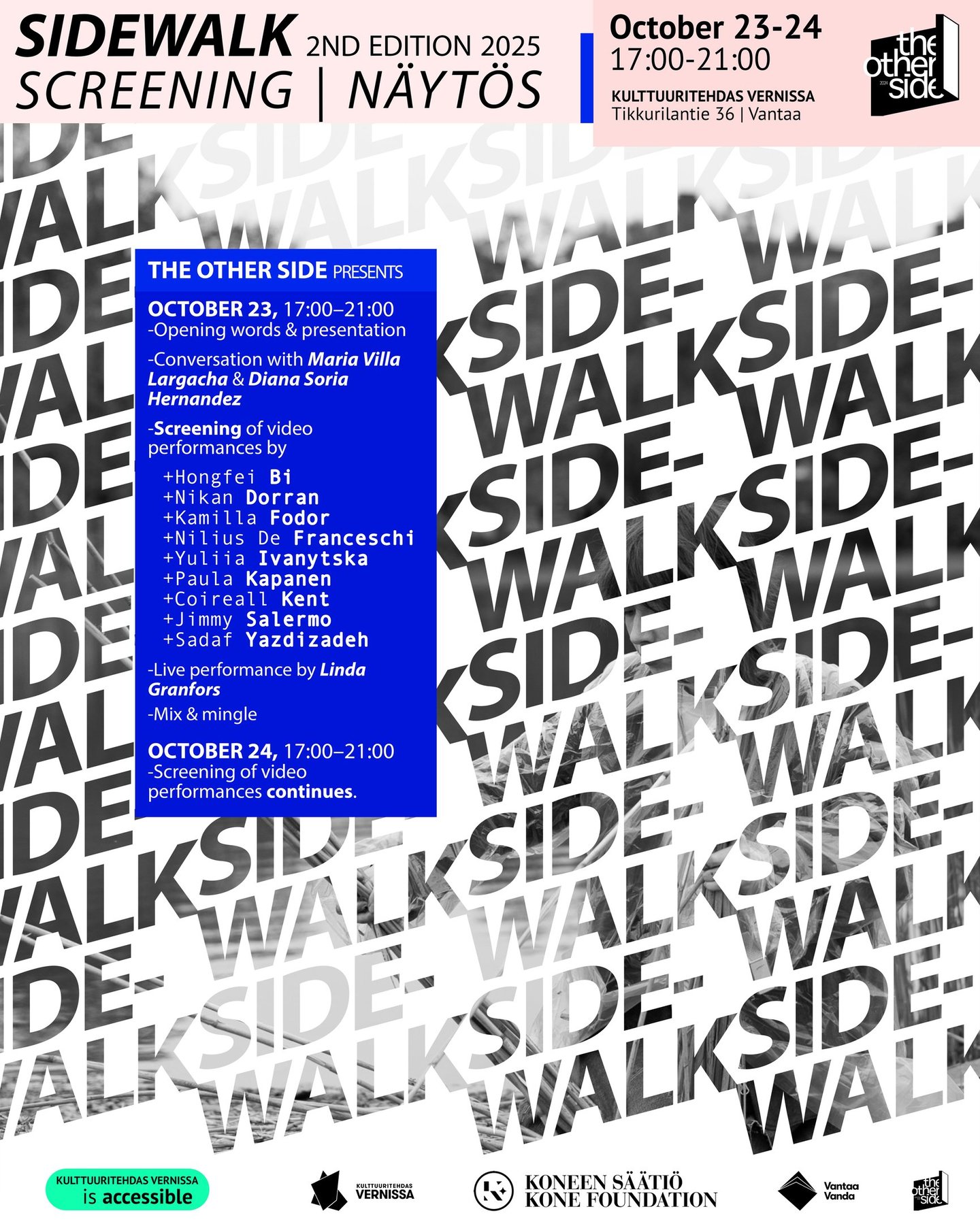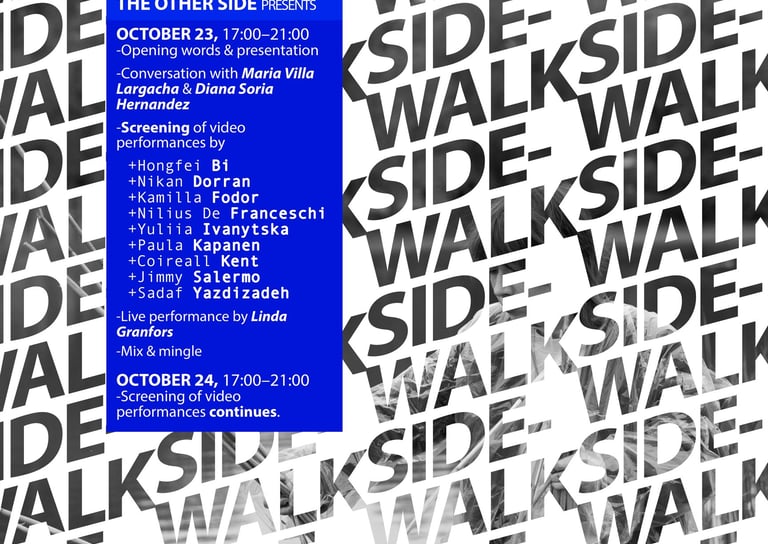 Performanssi tapahtuu välitiloissa; näkemisen ja nähdyksi tulemisen, liikkeen ja pysähtyneisyyden, todellisen ja mahdollisen välissä. The Other Side on tila kokeiluille; kohtaamisille jotka mullistavat perspektiivimme ja määrittelevät läsnäolon uudelleen. 2025 alkaa näyttää jännittävältä vuodelta. Sidewalk 2025 lanseerataan pian, ja sitä seuraa monta One-Day Stand -tapahtumaa sekä The Other Side performanssitaidefestivaali.