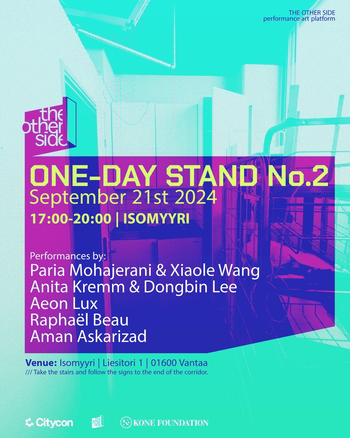 The Other Side esittää: ONE-DAY STAND -tapahtuman toinen osa Isomyyrin kauppakeskuksessa Myyrmäessä, Vantaalla. Esiintyjinä Paria Mohajerani & Xiaole Wang, Aeon Lux, Anetta Krem & Dongbin Lee, Raphael Beau ja Aman Askarizad. Tapahtuma alkaa 21. syyskuuta klo 17:00. Löydät paikalle, kun nouset pääportaita toiseen kerrokseen ja seuraat opasteita suoraan käytävän päähän.
