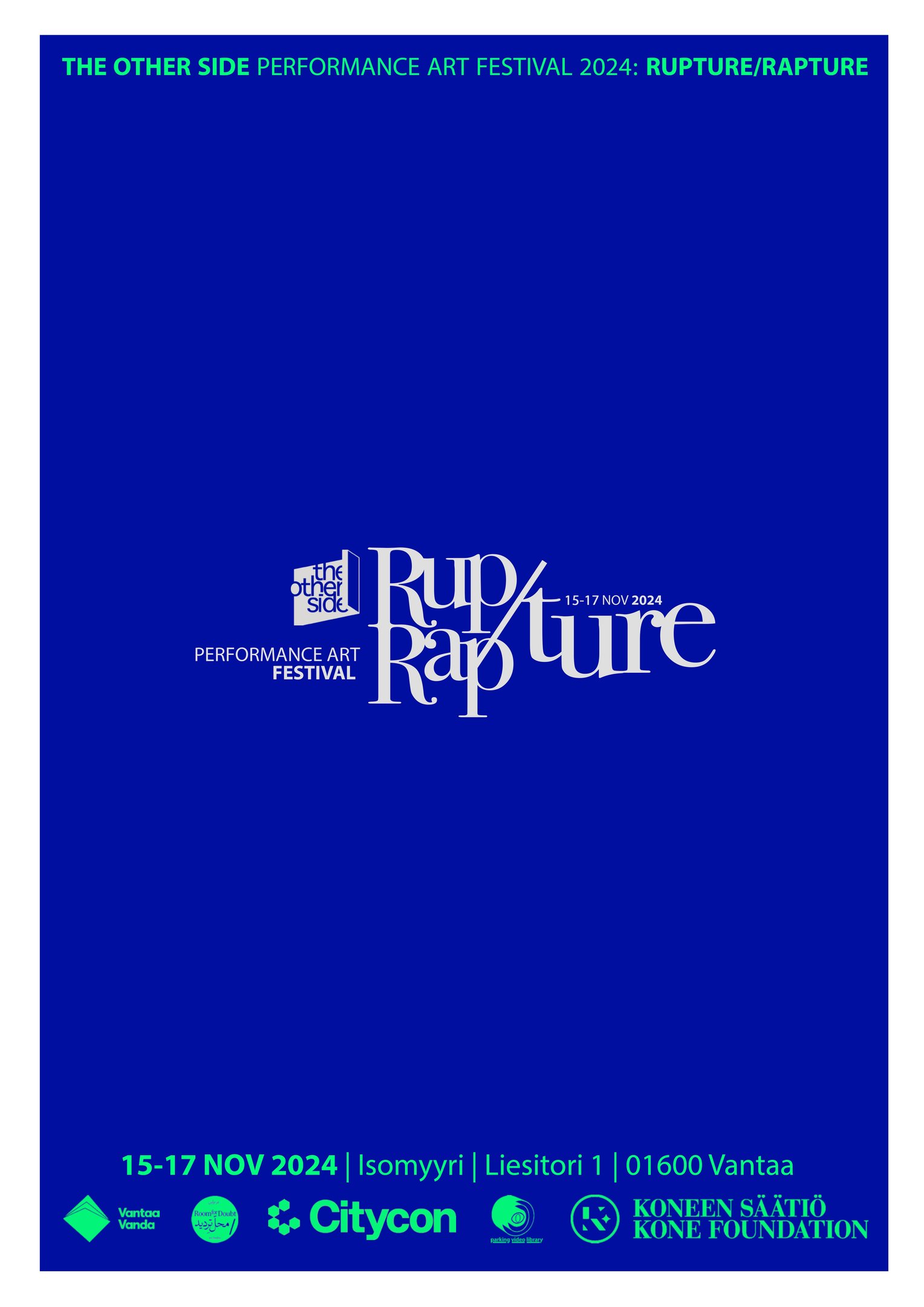 Olemme innoissamme saadessamme ilmoittaa, että The Other Side Performanssitaidefestivaali tapahtuu 15.-17. marraskuuta! Luvassa on jännittävä kattaus taiteilijoita ja projekteja.