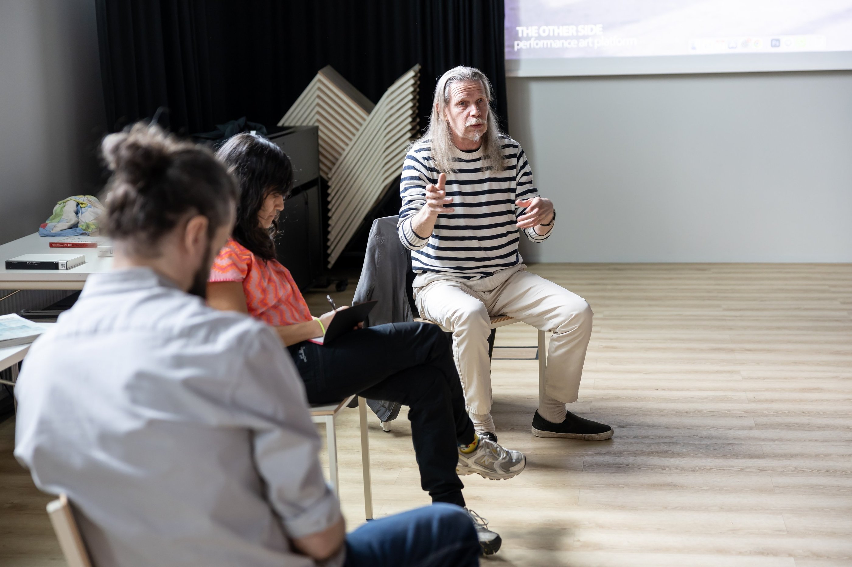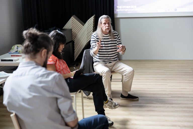 Sidewalk 2025 -projektin ensimmäinen sessio toteutettiin Kaupunkikulttuurikeskus Mosaiikissa Kivistössä, Vantaalla toukokuun kolmantena päivänä. Sessio johdatteli osallistujat perimmäisen kysymyksen äärelle: “Mitä on performanssitaide?” Lisäksi avattiin keskustelu live-esiintymisen ja kameraesiintymisen välisistä eroista. Ohjatun keskustelun ja reflektion kautta ryhmä tutki performanssitaiteen rajoja sekä sitä, miten intentio, konteksti ja väline määrittävät tai rikkovat konventionaalista ymmärrystä taidemuodosta. Sessiolla luotiin konseptuaalinen pohja tuleville työpajoille.