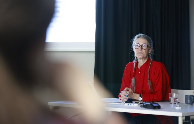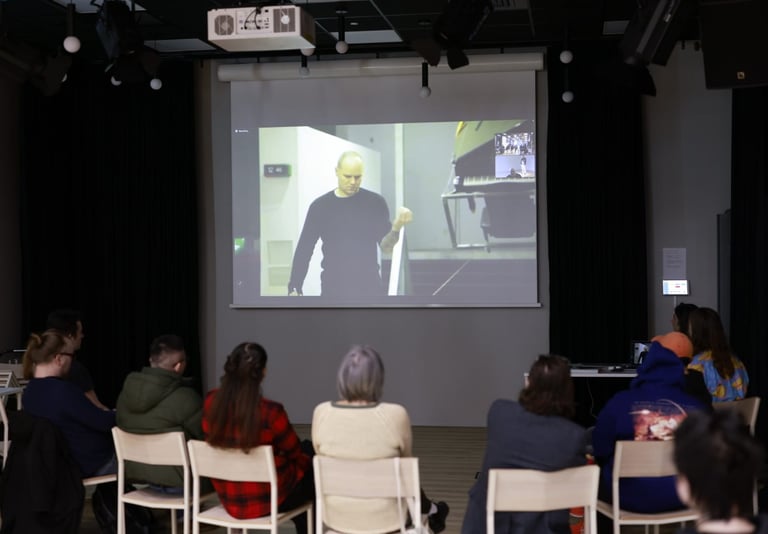 On May 10, 2025, the third session was led by Finnish artist and educator Leena Kela. The session focused on the origin of artistic ideas and how materials, the body, and the environment can serve as raw material for performance. Participants were introduced to concepts from the Fluxus movement and explored the use of scores—simple instructions or frameworks—for creating performance actions. Exercises encouraged spontaneity and intuitive composition, inviting participants to generate short conceptual performances using everyday materials.