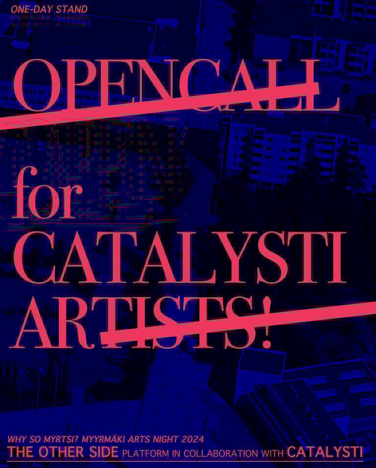 THE OTHER SIDE performance art platform, in collaboration with Catalysti RY, is announcing an open call for performance artists for Myyrmäki Arts Night 2024, celebrating Vantaa's 50th and Why So Myrtsi's 10th anniversaries. The event is on August 22, 2024, from 16:00 to 19:00 in Myyrmäki, Vantaa. Catalysti members are invited to submit proposals. Performances will take place on the Myyrmäenraitti pathway.