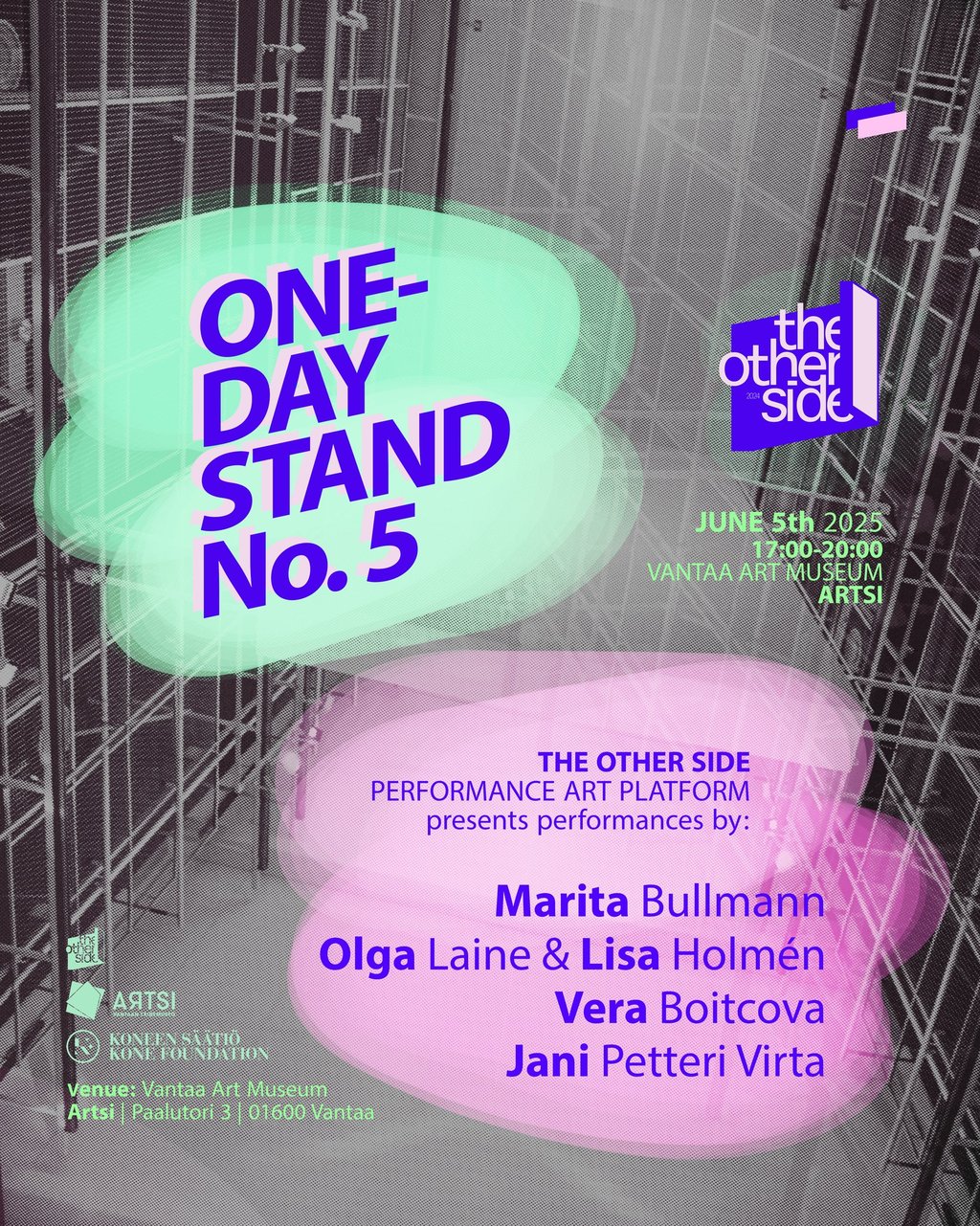 The One-Day Stand No.5 comes to our audiences in collaboration with Vantaa Art Museum Artsi and within the context of the exhibition, Steps in the City. As the exhibition explores the cultural and visual dimensions of urban space, performance art brings these themes into the present moment through live and lived action and direct engagement. Its ephemeral and embodied nature resists fixed meanings, inviting audiences to witness and participate in shifting dynamics of presence, power, and public space. Whether through subtle gestures or bold interventions, performance art creates fleeting yet impactful encounters, transforming the way we experience the public and private spaces and the relationships within it.